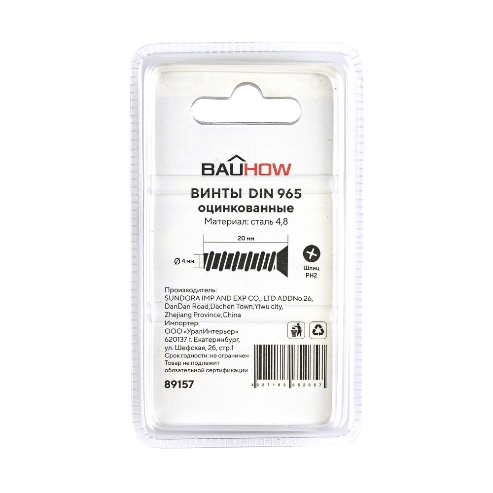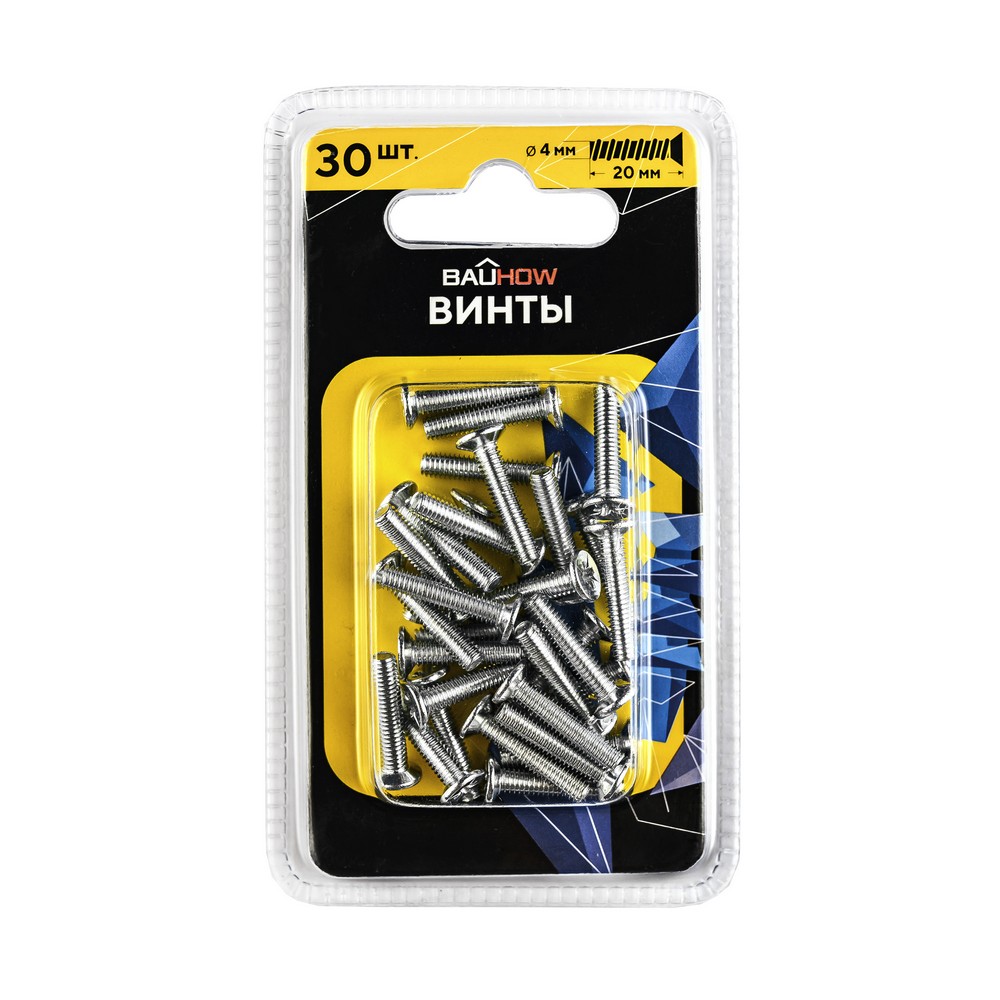 Винт DIN965 М4х20 потайная головка, сталь 4,8 BAUHOW оцинкованный (30шт/блист)